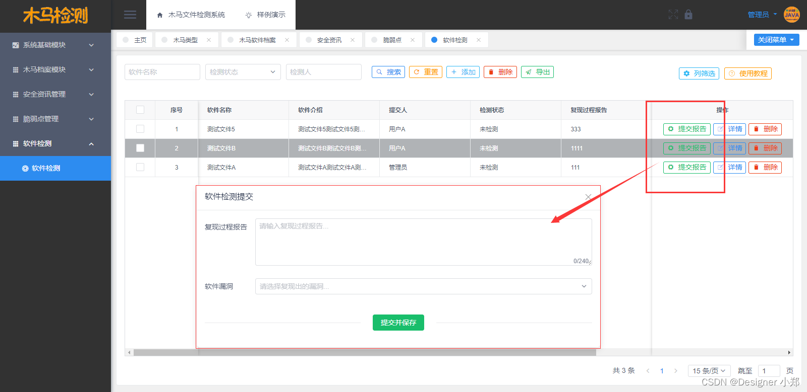 软件检测室木马文件检测系统的核心业务,软件检测字段包括软件ID、软件名称、软件介绍、提交人、检测状态、过程报告、软件漏洞、检测人,用户可以发起软件检测申请,管理员对软件进行检测反馈,上传过程包括和复现软件漏洞。