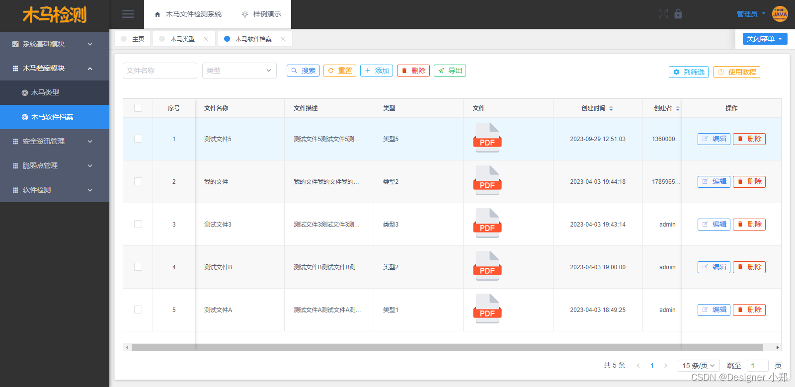 木马是木马文件检测系统的核心,所以需要建立木马软件模块,木马软件的数据包括软件名称、软件描述、软件类型、文件、创建人、创建时间、更新人、更新时间,管理员和用户都可以新增、删除、编辑和条件查询木马数据。