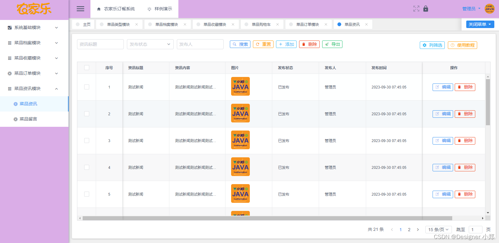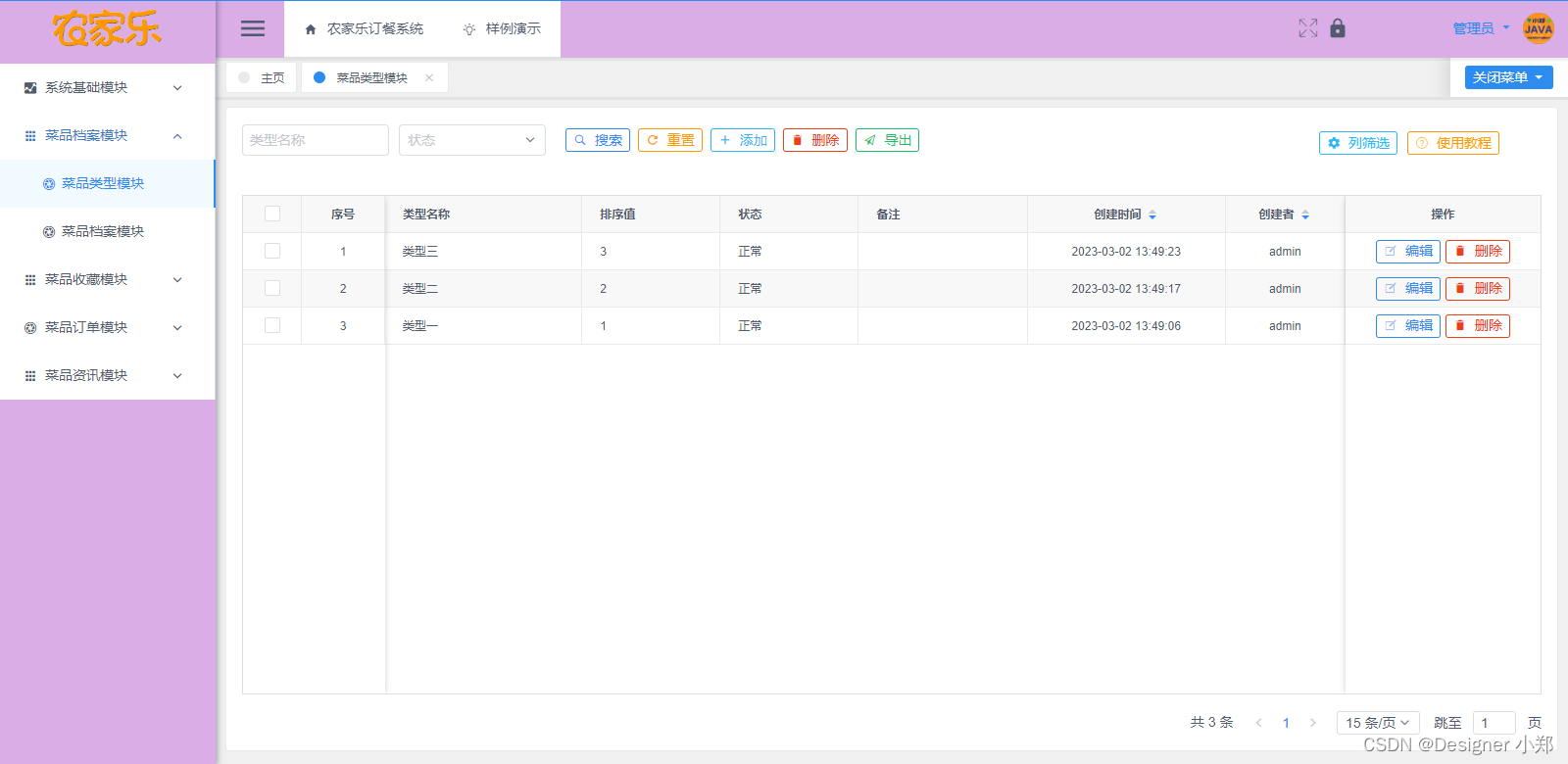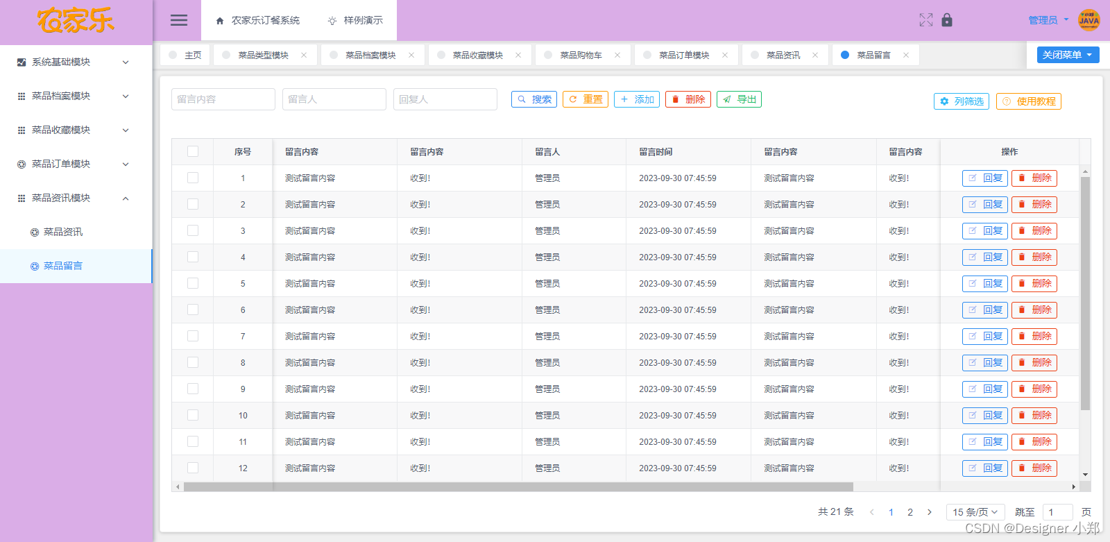 基于JAVA+Vue+SpringBoot+MySQL的农家乐订餐系统,包含了菜品类型模块、菜品档案模块、菜品收藏模块、菜品订餐模块、菜品资讯模块,还包含系统自带的用户管理、部门管理、角色管理、菜单管理、日志管理、数据字典管理、文件管理、图表展示等基础模块,农家乐订餐系统基于角色的访问控制,给订餐管理员、配送人员使用,可将权限精确到按钮级别,您可以自定义角色并分配权限,系统适合设计精确的权限约束需求。