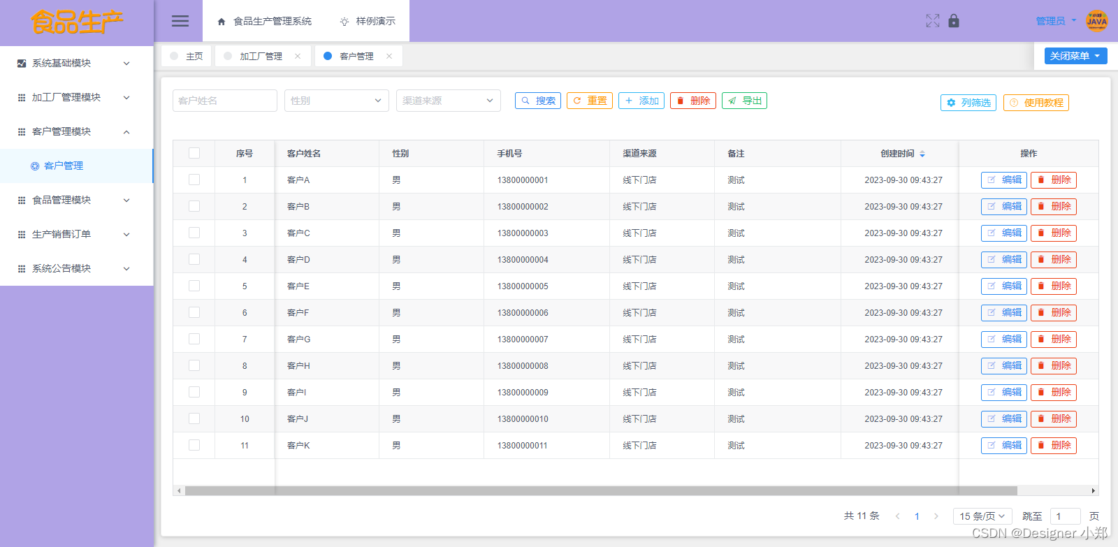 客户管理模块主要是把客户汇总,做成可视化表格,便于对客户进行增删改查等基本操作的管理。
