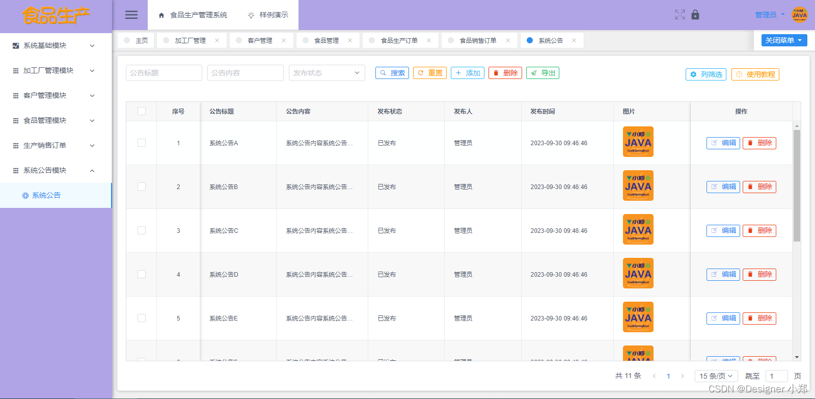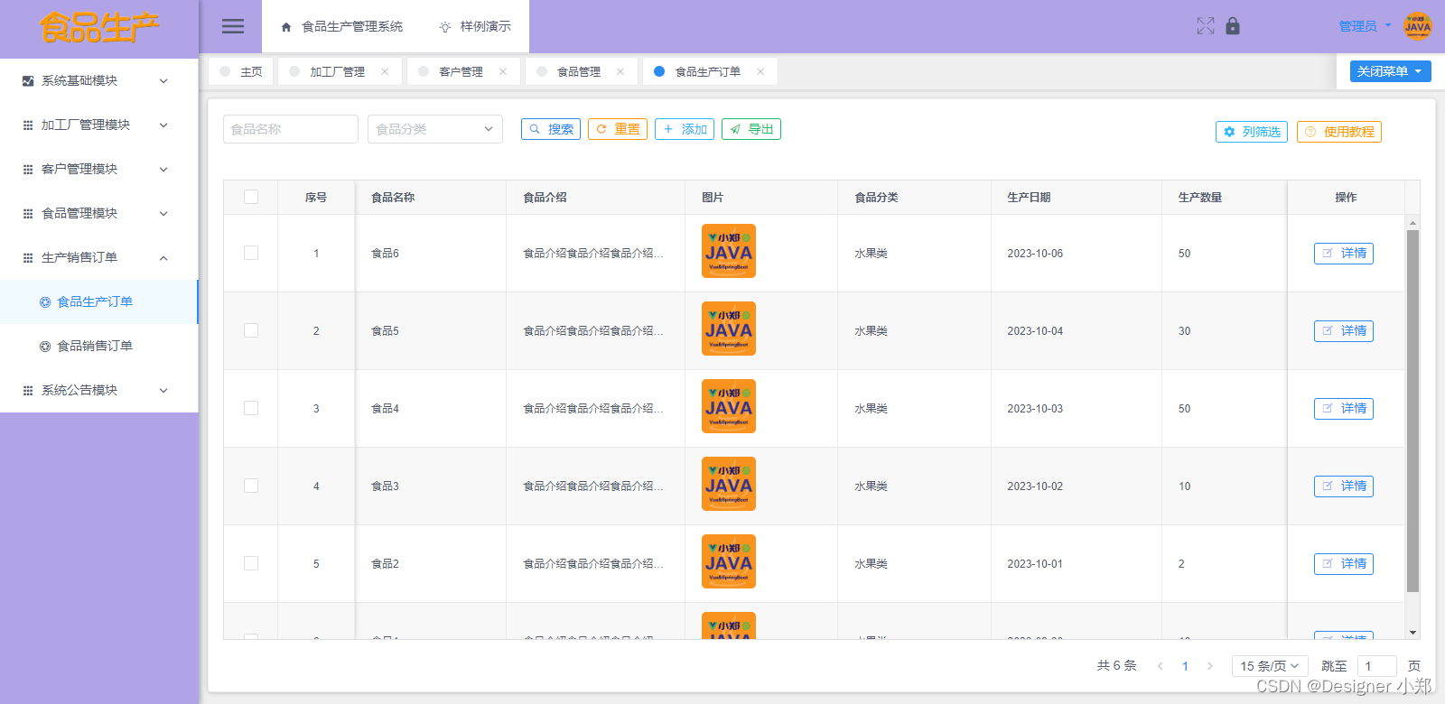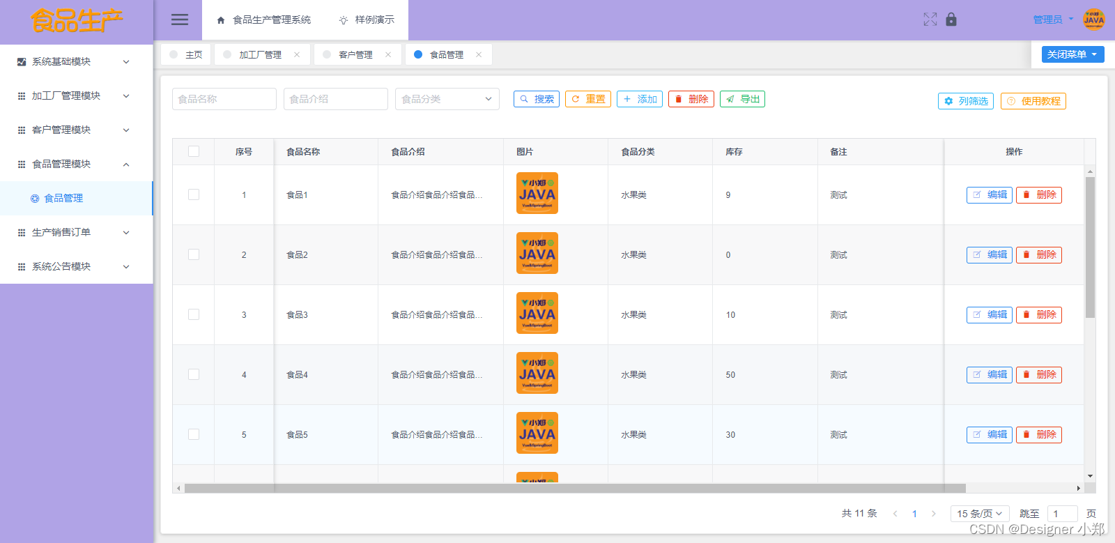 食品管理模块主要对已经产出的食品进行信息分类展示,管理员可以对它进行查看,并进行增删改查功能。