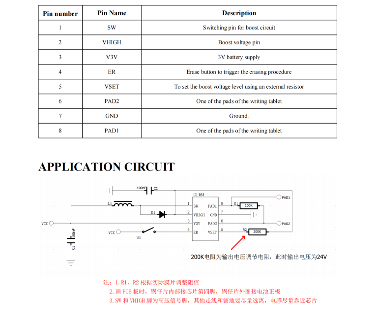 泛海微FHchip161 为一款内置升压电路并可以自动产生擦写脉冲的手写板擦写控制芯片。擦写脉冲 1 个,每次脉冲的输出和上一次的脉冲相反。脉冲电压可以通过外置电阻设置,其电压值满足:Rset=10K*Vpulse-40K如果想获得 24V 的脉冲电压,则:Rset=200KΩ 161 为一键式自动擦写控制器,其触发为 ER 端从低到高的上升沿,亦即连接该 pin 的锅片开关按压行为。在一次脉冲产生周期内的多次按压行为仅触发一次擦写脉冲的产生,直至 1 个脉冲完全结束,等待下一个按压动作触发。