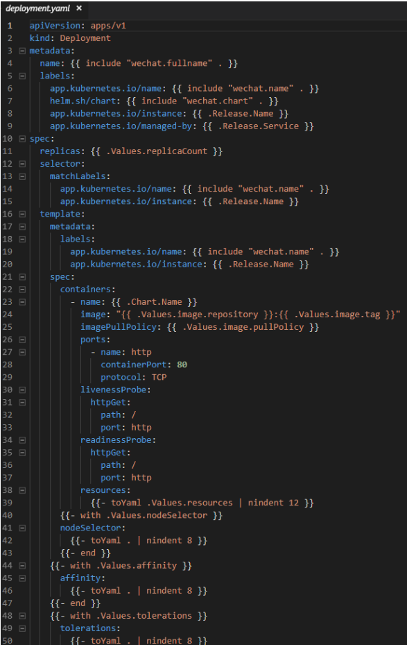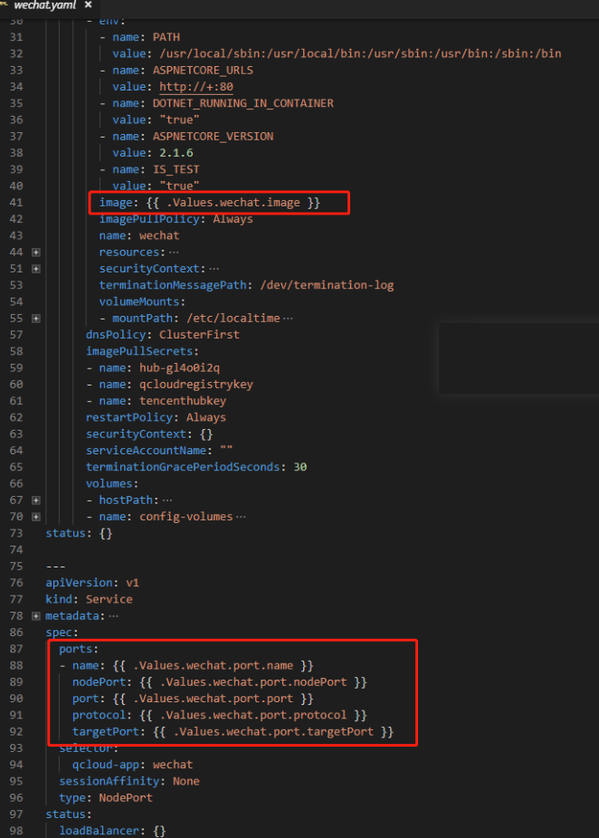 templates/_helpers.tpl:定义子模版,在模板中{{ include "wechat.fullname" . }}就是引用子模板。