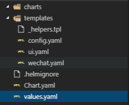 接下来我们编写一个自己的chart,没有那么复杂,只是chart的简单操作。这里我将我们服务两个微信服务(一个后台,一个UI)打包成一个chart。