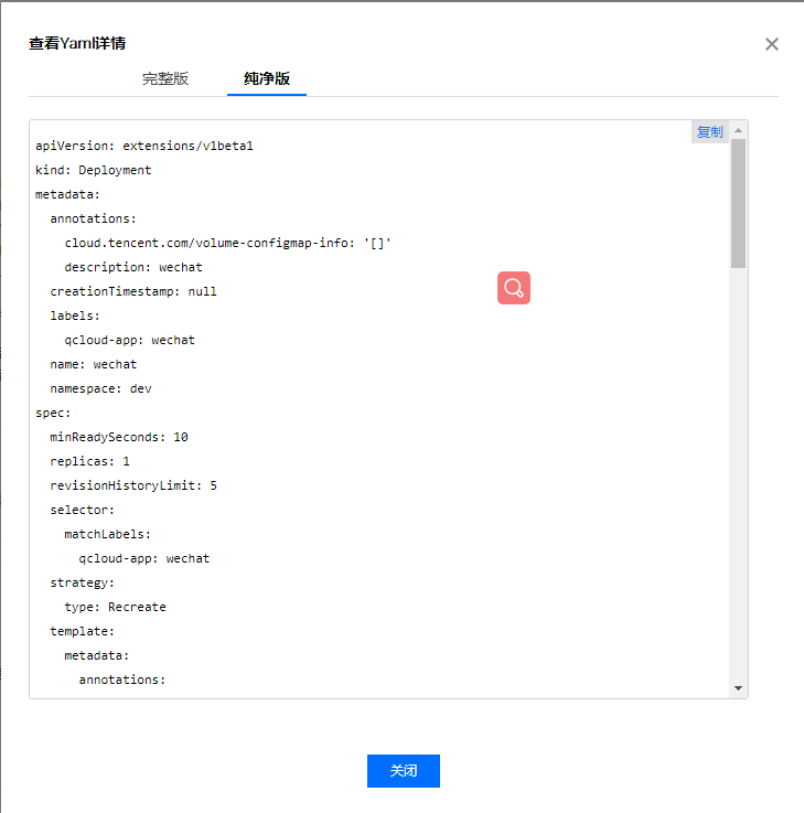 对于配置,这里教大家一个偷懒的方式,可以将现成服务的yaml配置直接拉下来,我们是使用腾讯云的容器服务,在已部署的服务中我们可以直接查看它的YAML配置,直接复制下来稍微改动即可。
