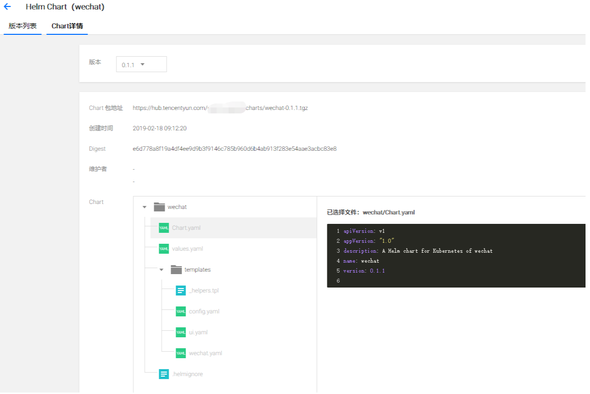 helm push myapp-1.0.1.tgz mychart 上传成功后在Tencent Hub即可看到我们上传的chart的信息了