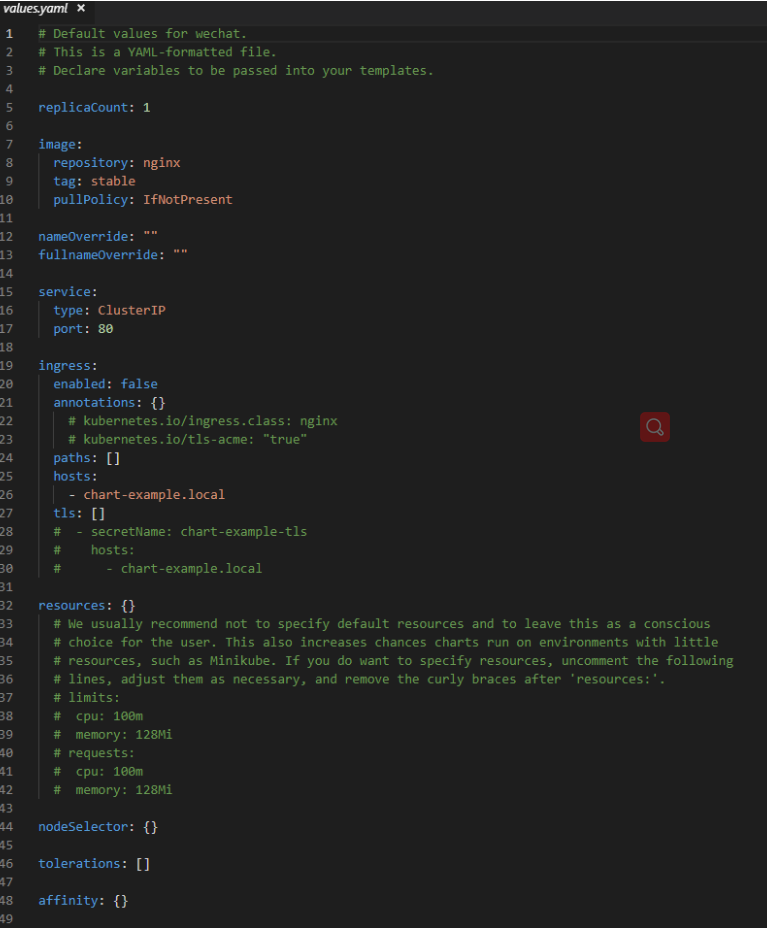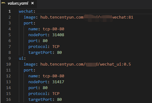 而后我跟据需要将少数配置进行参数化,将需要参数化配置的内容写在values.yaml中即可。这里我只将iamge和ports进行参数化配置。