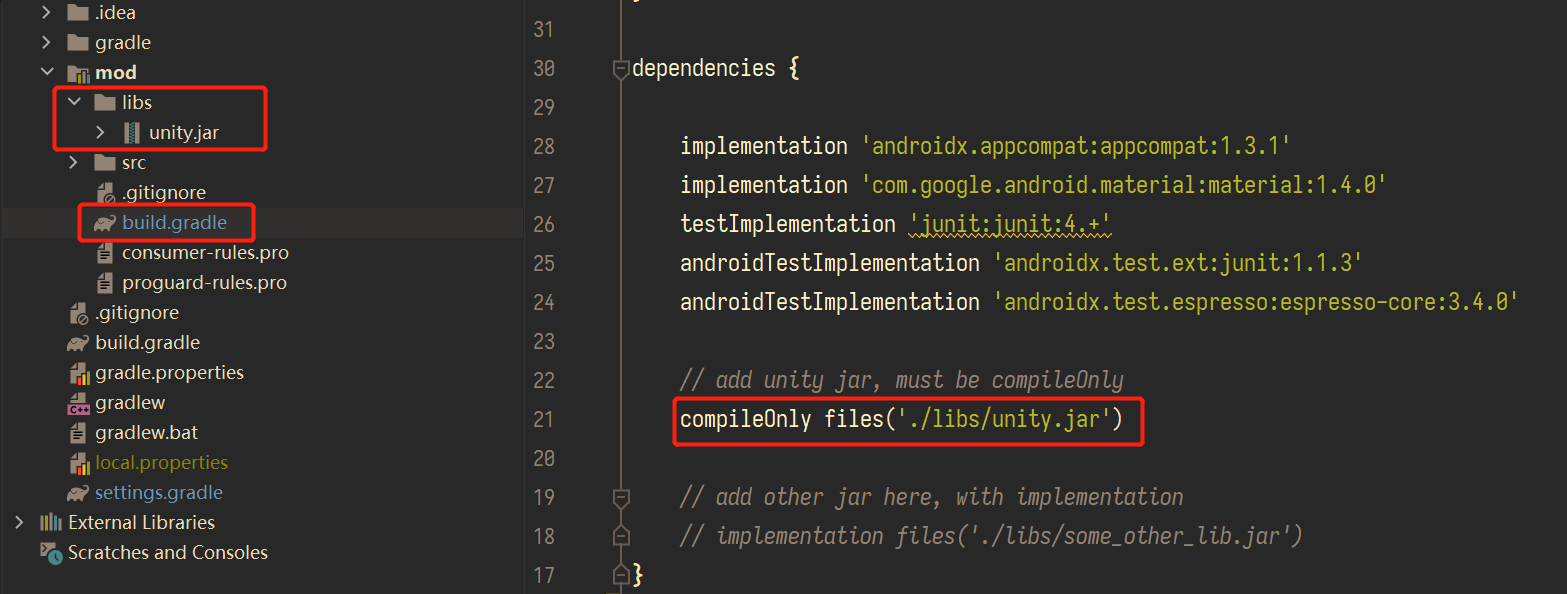 参考Android 官方文档添加依赖,将该 jar 文件复制到 Android 工程中的对应模块的 libs 目录中,具体是复制哪一个 jar 无关紧要,因为后面的流程中并不会实际加入这个 jar 包。在复制的之后可以修改一个名字,例如修改为 unity.jar。然后修改 gradle 构建文件,注意这里是修改模块目录下的 build.gradle 而非根目录下的。在 dependencies 中添加如下内容: