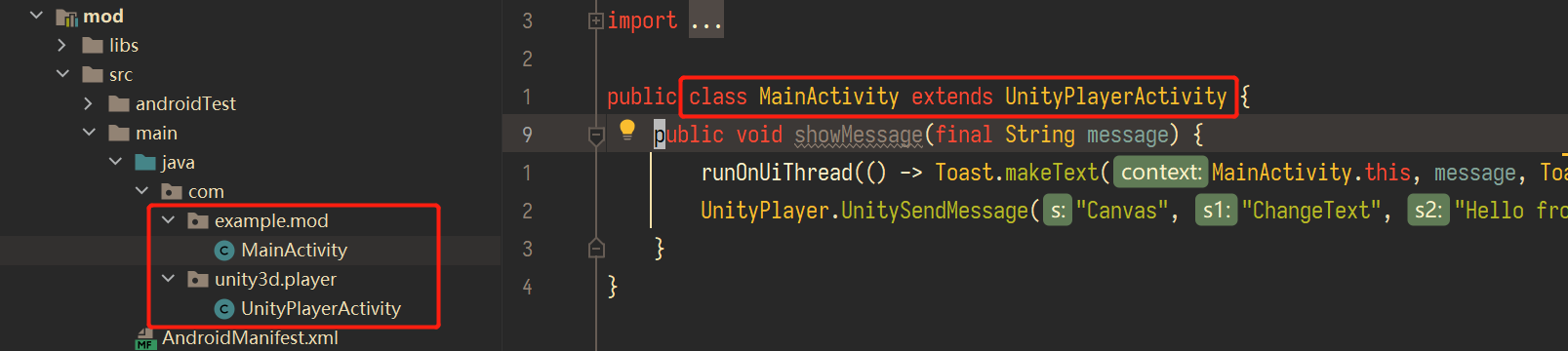 UnityPlayerActivity #在这里,我们添加一个 showMessage 函数用于给 Unity 调用,同时,在这个函数里面,我们通过 UnityPlayer.UnitySendMessage 来调用 Unity 中的函数。这个 UnityPlayer 定义于我们引入的 unity.jar 文件中。其中第一个参数是 Unity 场景中的对象名,第二个参数是需要调用的函数名,第三个参数是传递的参数:
