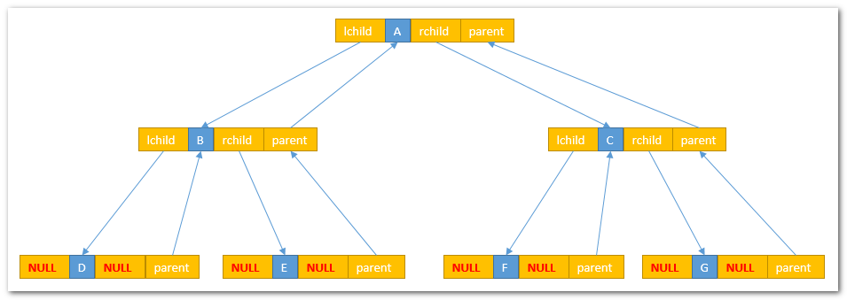 }以上是单向二叉树的图形和代码实现方法,其实二叉树还有双向表示的方法,就是让子节点有一个指针指向了父节点,这样就无论哪个节点,我们都可以方便的找到其父节点和子节点了。如下图: