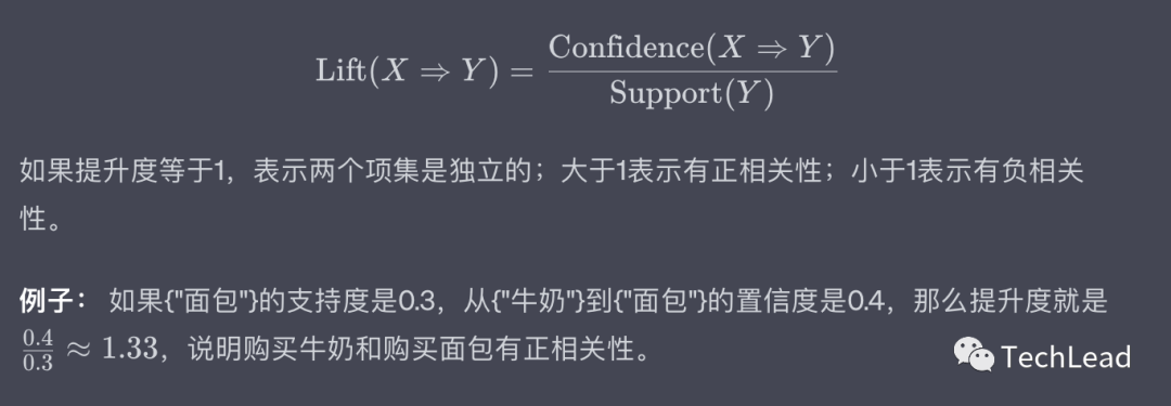 例子: 在超市购物数据中,如果“牛奶”和“面包”这一组合经常一起出现在同一个购物篮里,并且出现的次数超过了最小支持度,那么{"牛奶", "面包"}就是一个频繁项集。