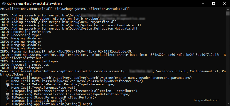 1 | ilrepack /lib:D:\Dependencies /out:Walterlv.Demo.AssemblyLoading.exe Walterlv.Demo.AssemblyLoading.exe Ben.Demystifier.dll System.Collections.Immutable.dll System.Reflection.Metadata.dll |