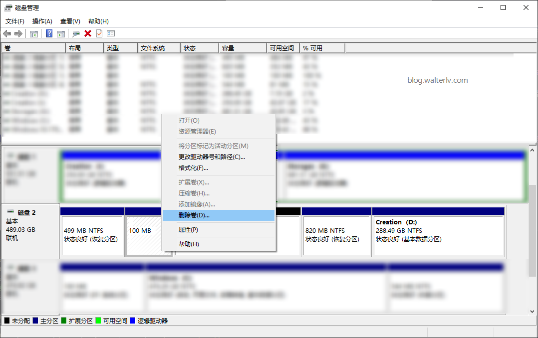 这个时候,回到磁盘管理中,F5 刷新,你可以看到原本不可删除的 EFI 分区,现在可以直接使用鼠标删除了。点击一下“删除卷”即可。