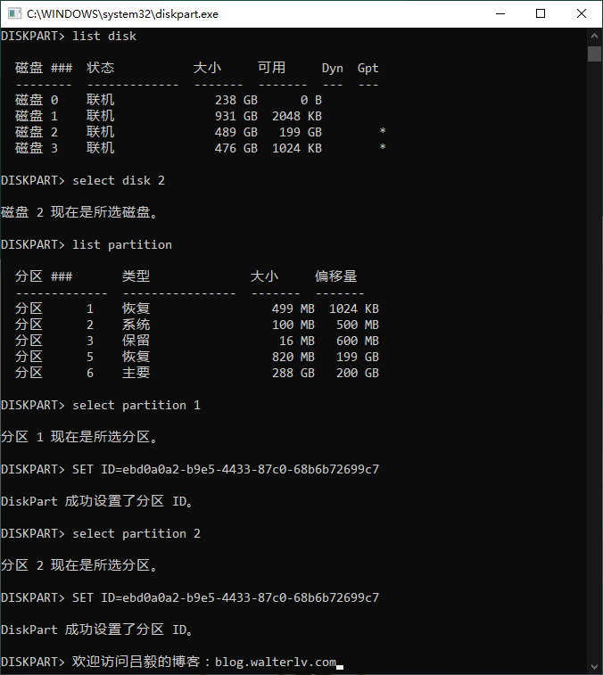 1 2 3 4 | DISKPART> SET ID=ebd0a0a2-b9e5-4433-87c0-68b6b72699c7 DiskPart 成功设置了分区 ID。 |