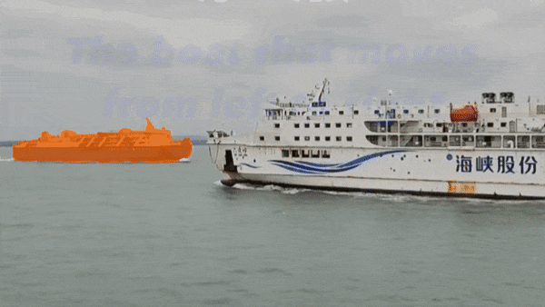 如下MeViS视频展示了两艘相向行驶的船,“向右行驶的那艘船”这种语句描述无法通过观察单帧图像定位目标船只, 展示了在MeViS数据集中获取时序信息的重要性 。