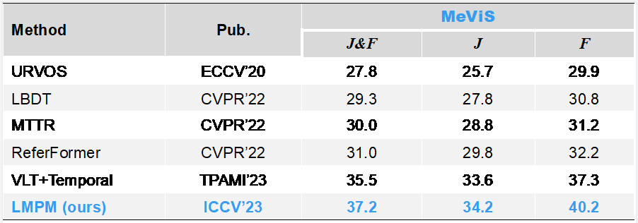 如下为 MeViS 数据集 Val 部分目前的 benchmark 结果。最优结果仅为 37.2%,这表明仍存在巨大的发展和研究空间。