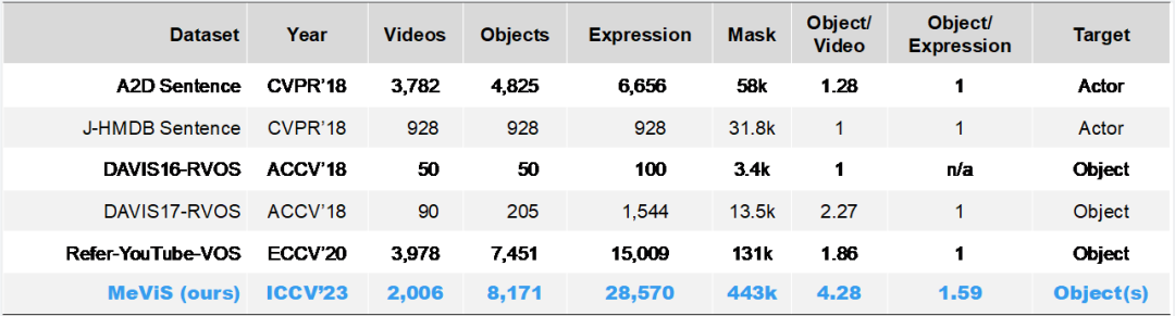 MeViS包含共2,006个视频,对视频集中的8,171个物体提供了总共28,570个自然描述语句。从下表中可以看出,MeViS在 自然语句数量、物体数量、Mask规模等方面显著超越其他数据集 。