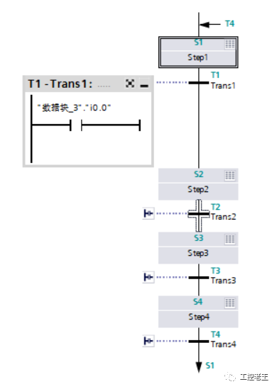 每个过渡都需要一个过渡条件。链中的最后一个过渡始终连接到链中的第一个步骤以创建闭环。因此,步进链是循环处理的。