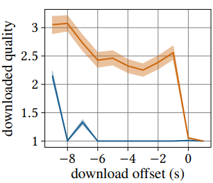 图 9 比较了使用两个不同的视窗预测器观看同一个视频时,在用户的视窗中已下载好的 tile 的平均质量与“下载偏移量”的关系,下载偏移量为 -6 意味着在播放之前 tile 已经下载好了 6 秒钟。显然 StaticPredictor 提供的平均可见质量比 NoPredictor 更高,无论缓冲级别如何。