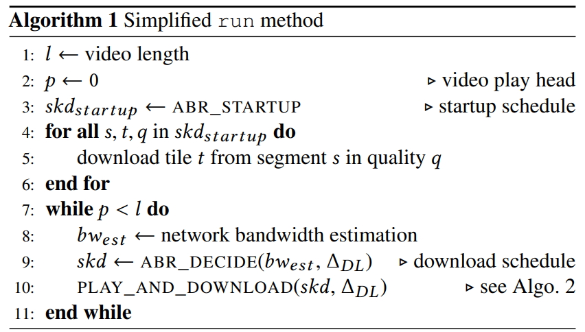 在算法 1 的第 5 行和算法 2 的第 13 行和第 17 行,“下载”意味着使用具有适当延迟和带宽的 NetworkModel 类,并将下载的 tile 放入缓冲区。