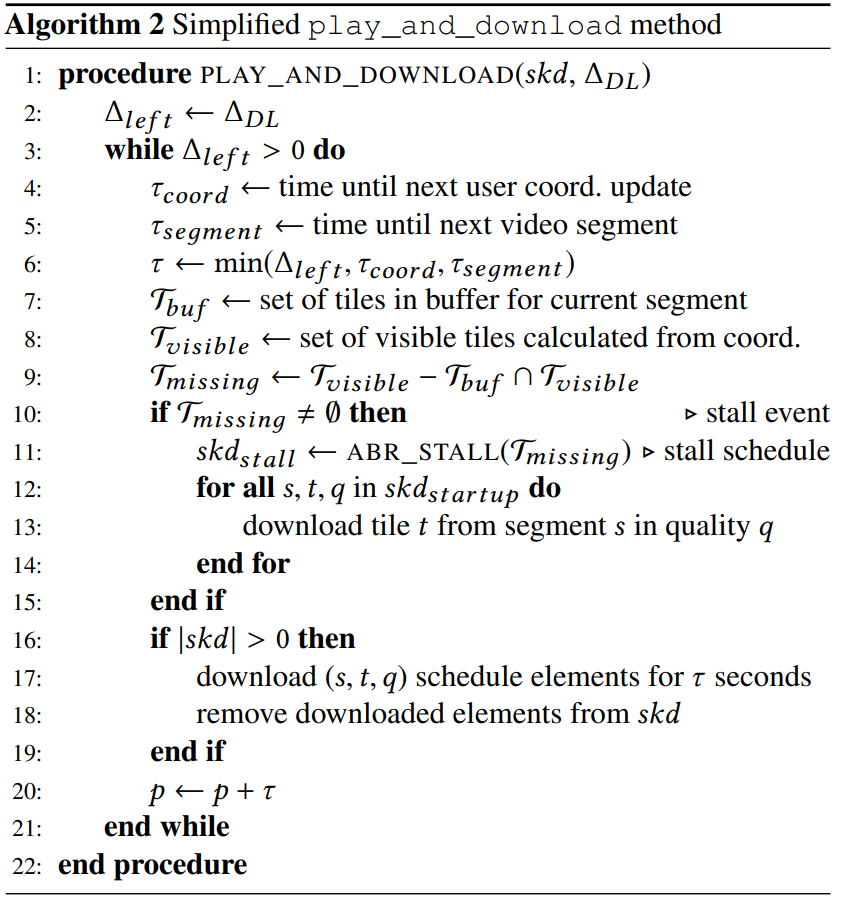 算法 2 详细解释了模拟器中最复杂的函数之一 Session::play_and_download 的逻辑。该函数允许同时进行视频播放和 tile下载,同时确保 NetworkModel 和 UserModel 保持同步。这种方法比 Sabre360 带来了两个改进之处:
