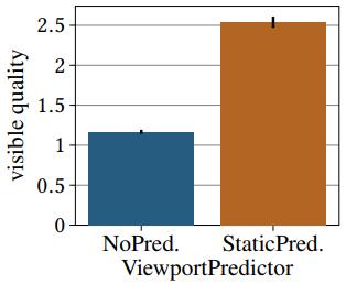 图 6 比较了在所有观看了该视频的用户中,使用两个不同的视窗预测器观看一个视频时的平均视觉质量,质量级别从1到5,可以看到 StaticPredictor 比 NoPredictor 提供了更高的平均可见质量。