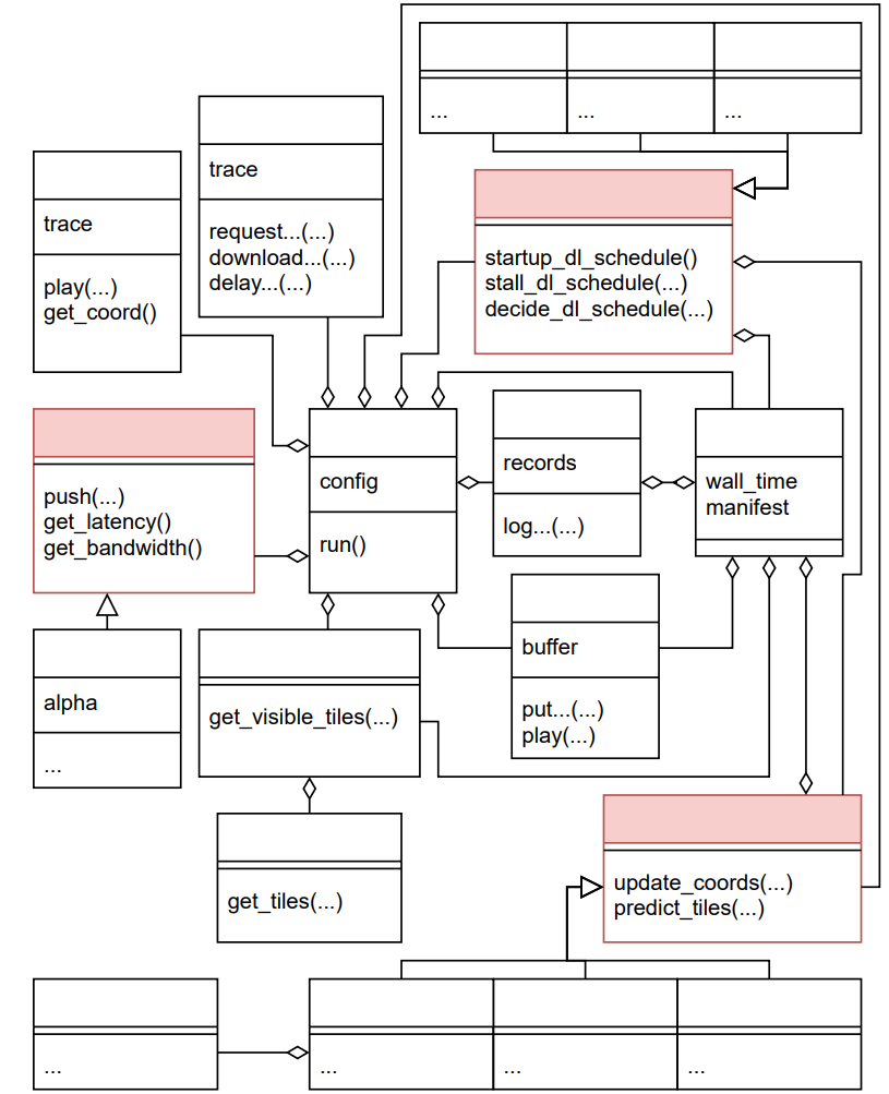 图 3 中呈现了简化的类结构,图中标红的类,包括 BandwidthEstimator、TiledABR 和 Viewport-Predictor,可以很容易地扩展以实现新的算法。