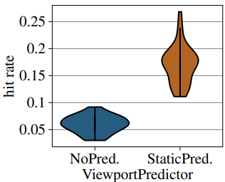 图 10 比较了使用两个不同的视窗预测器观看同一个视频时的“命中率”的分布。命中率是出现在用户视窗中的比特数与下载的总比特数的比值,可以看作是带宽效率的体现。可以看到,StaticPredictor 比 NoPredictor 更高效,并且浪费的带宽更少。