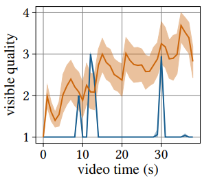 图 7 比较了在所有观看了该视频的用户中,使用两个不同的视窗预测器观看一个视频时的平均视觉质量与视频时间的关系。从该图可以更明显地看出,StaticPredictor 比 NoPredictor 提供了更高的平均可见质量。
