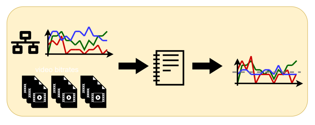 注意,为了使 ABR 算法之间的比较具有相关性,需要在算法能够适应网络限制的情况下进行,因为不管网络带宽远大于或远小于视频速率,ABR 算法用处都不大。为了进行 ABR 算法之间的相关比较,作者提供了一个 Jupyter 笔记本,将网络 trace 相对于视频比特率进行缩放,如图 1 所示。