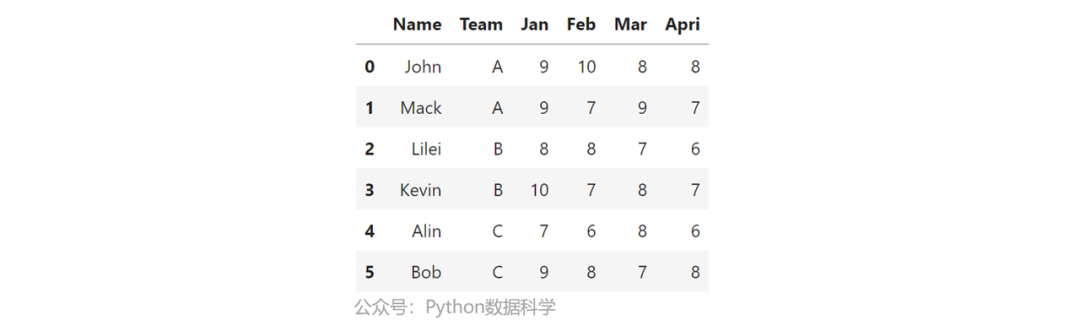 kv = {'Name': {0: 'John', 1: 'Mack', 2: 'Lilei', 3: 'Kevin', 4: 'Alin', 5: 'Bob'},