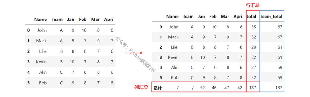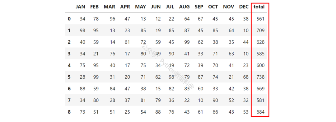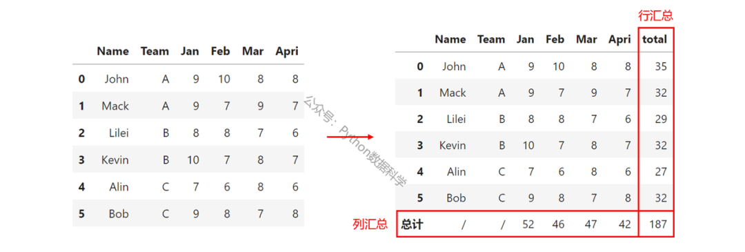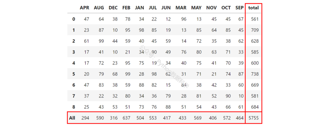 此时已得到行方向的求和,如果我们想继续计算列方向求和并显示出来如何操作呢?可以借助pivot_table