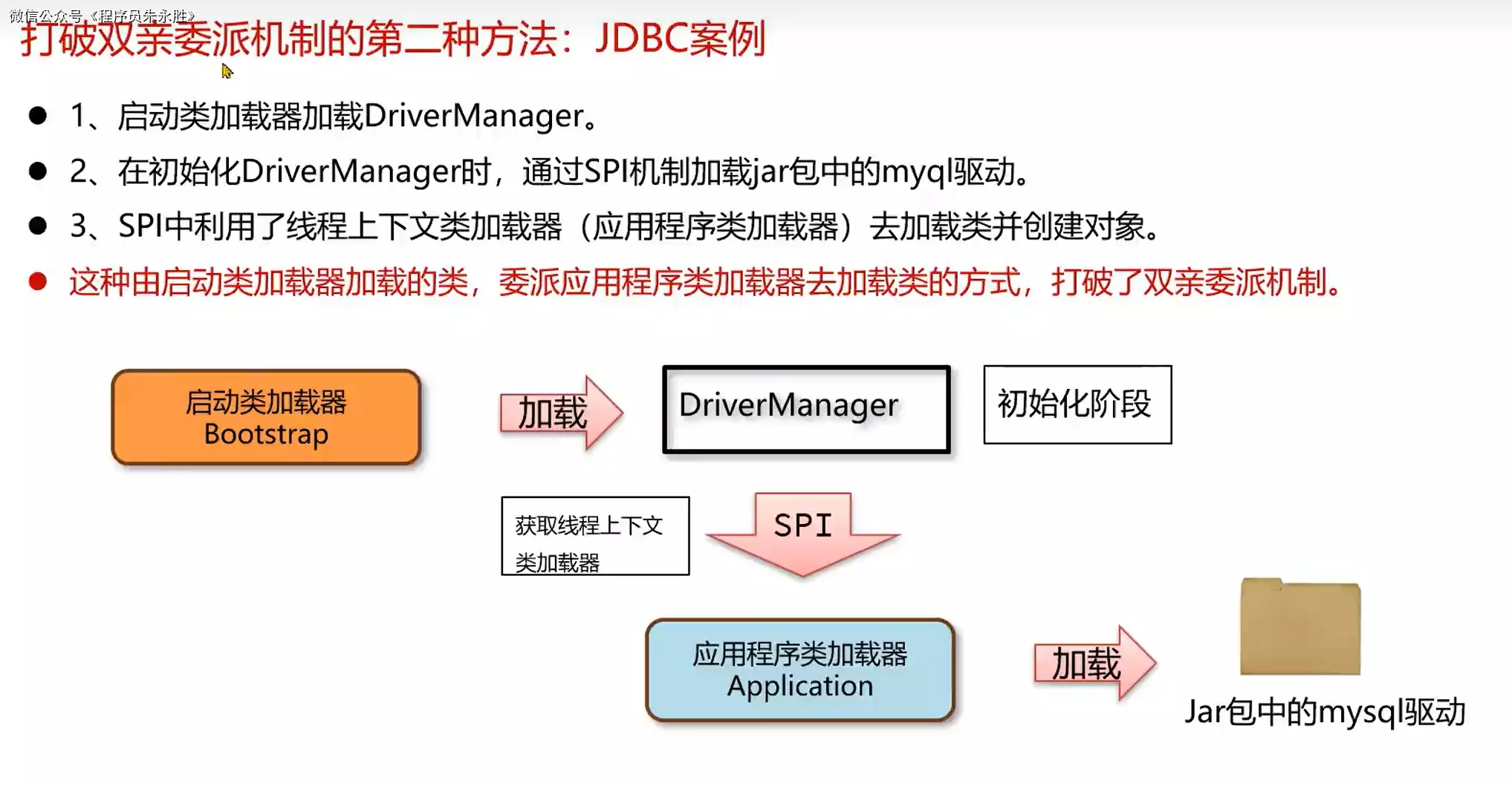 Java 中经典的线程上下文类加载器的案例就是 JDBC 规范。JDBC 规范中定义了一系列接口,这些接口通常由驱动程序提供实现。当 JDBC 的客户端在应用程序中加载驱动程序时,驱动程序的类加载器加载了具体的类,不同的数据库的驱动程序类在不同的类加载器中。
