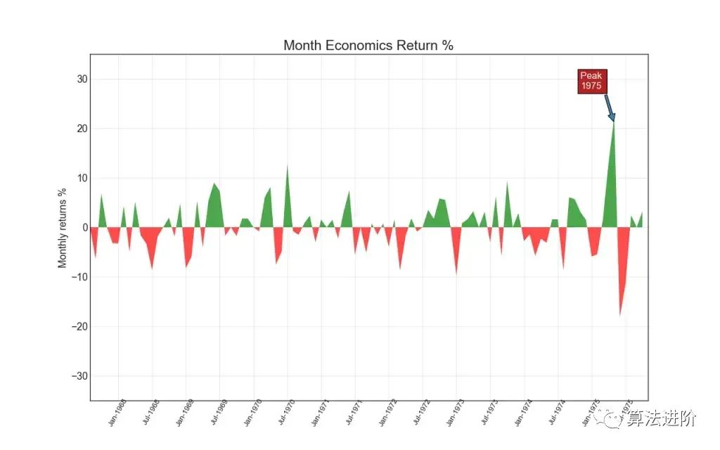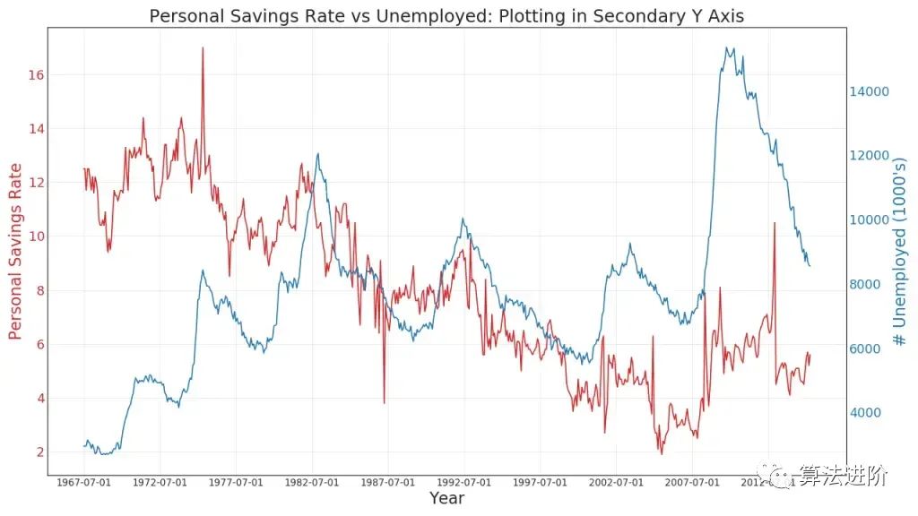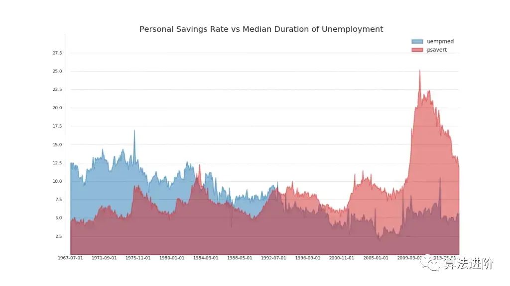 非堆叠面积图用于可视化两个或多个系列相对于彼此的进度(上升和下降)。在下图中,您可以清楚地看到个人储蓄率如何随着失业持续时间中位数的增加而下降。非堆叠面积图很好地体现了这种现象。