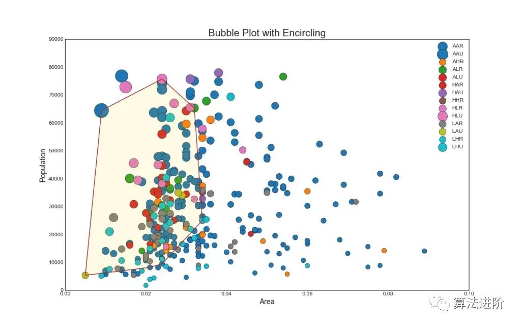 有时您想要显示边界内的一组点以强调它们的重要性。在此示例中,您从应圈出的数据帧中获取记录并将其传递给下面代码中描述的内容。encircle()