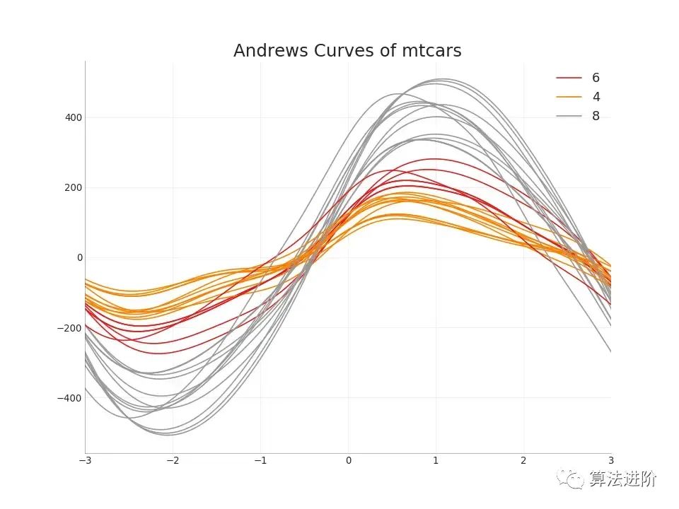 安德鲁斯曲线有助于可视化是否存在基于给定分组的数字特征的固有分组。如果特征(数据集中的列)无助于区分组 ( ,那么这些行将不会被很好地隔离,如下所示。cyl)