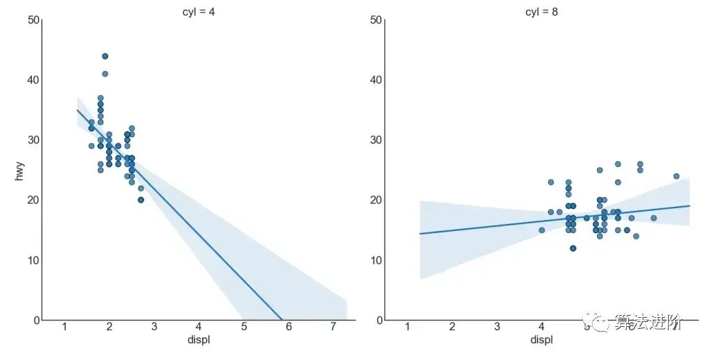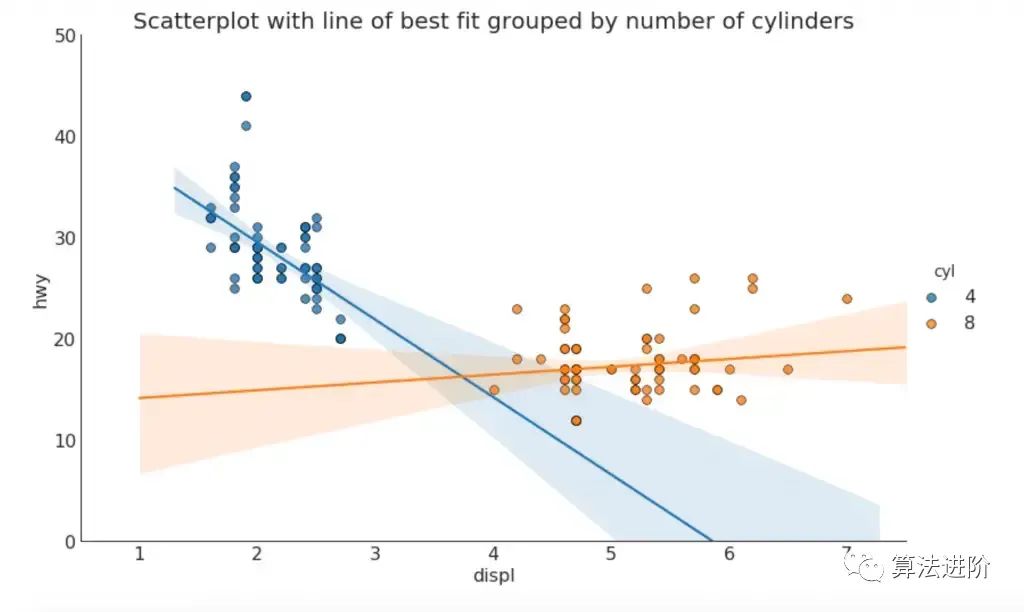 如果您想了解两个变量如何相互变化,最佳拟合线就是最佳选择。下图显示了数据中各个组之间最佳拟合线的差异。要禁用分组并仅为整个数据集绘制一条最佳拟合线,请从下面的调用中删除该参数。hue='cyl'sns.lmplot()