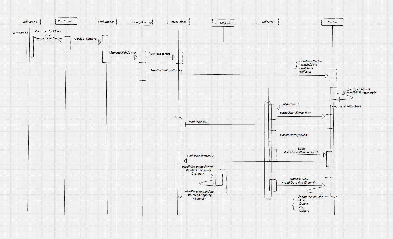 核心组件:Cacher,watchCache,cacheWatcher,reflector。其中 watchCache 作为 reflector 的 store,Etcd 作为 listerWatcher 的 storage,store 和 listerWatcher 作为参数用来构造 reflector。数据流大致如下: