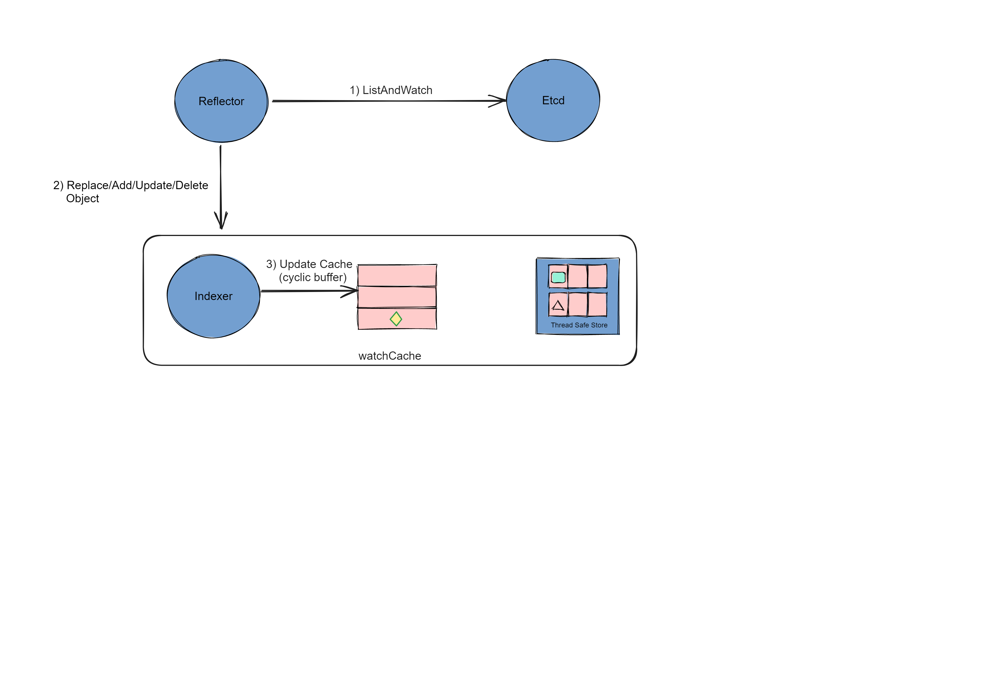 用来缓存数据的核心结构是 watchCache,其内部又两个关键结构:cache(cyclic buffer),store(thread safe store),分别用来存储历史的 watchCacheEvent 和真实的资源对象,其中 store 里面存储的是全量对象,而 cache 虽然是自适应大小的,但还是有最大容量限制的,所以他存储的 watchCacheEvent 所代表的对象集合并不一定能覆盖 store 的全部数据。