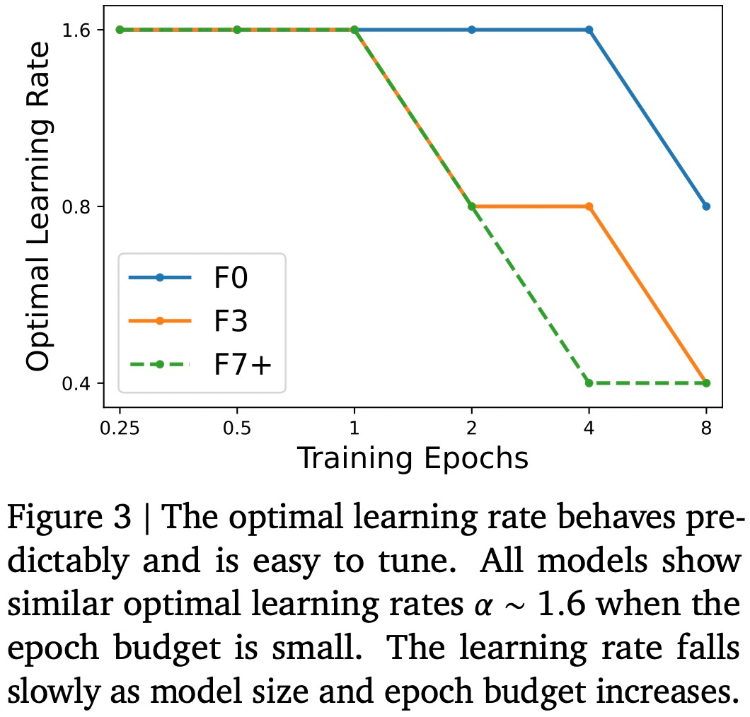 下图 3 绘制了 3 个模型在一系列 epoch 预算中观察到的最佳学习率(最大限度地减少验证损失)。研究团队发现对于较低的 epoch 预算,NFNet 系列模型都显示出类似的最佳学习率 𝛼 ≈ 1.6。然而,随着 epoch 预算的增加,最优学习率会下降,并且对于大型模型,最优学习率下降得更快。研究团队表示可以假设最优学习率随着模型大小和 epoch 预算的增加而缓慢且单调地下降,从而在 2 次试验内有效地调整学习率。