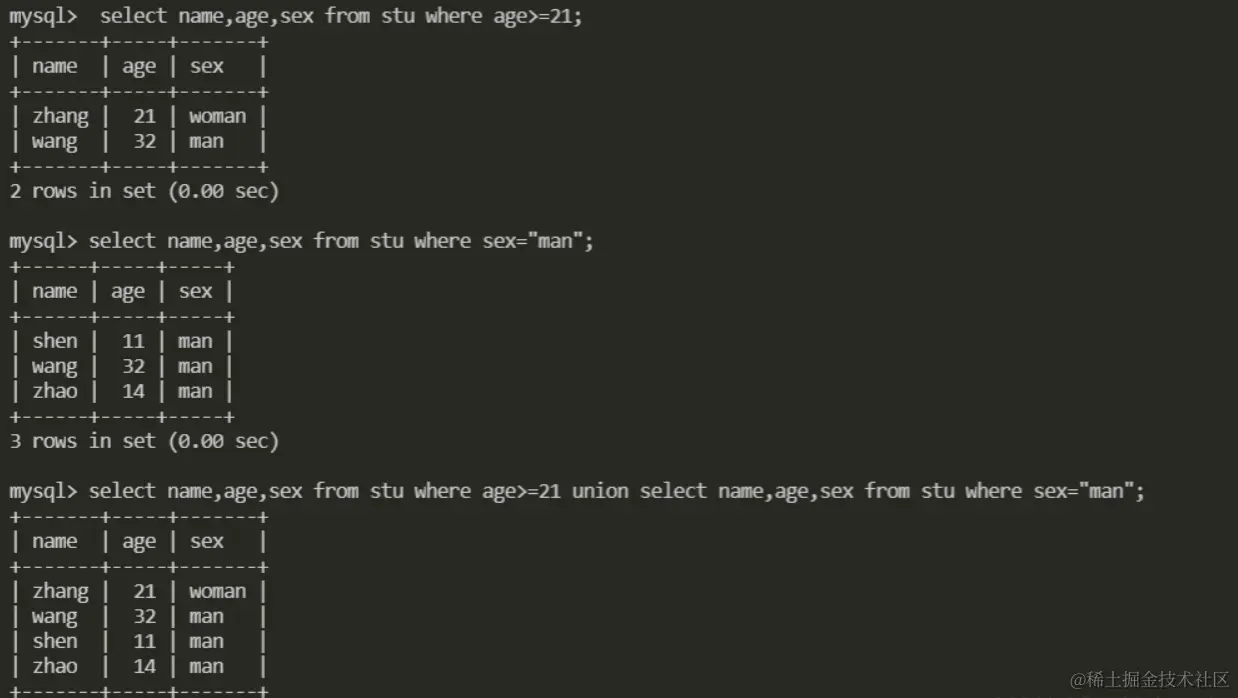 union [all|distinct] -- union默认去重,不用distinct修饰,all表示显示所有重复值