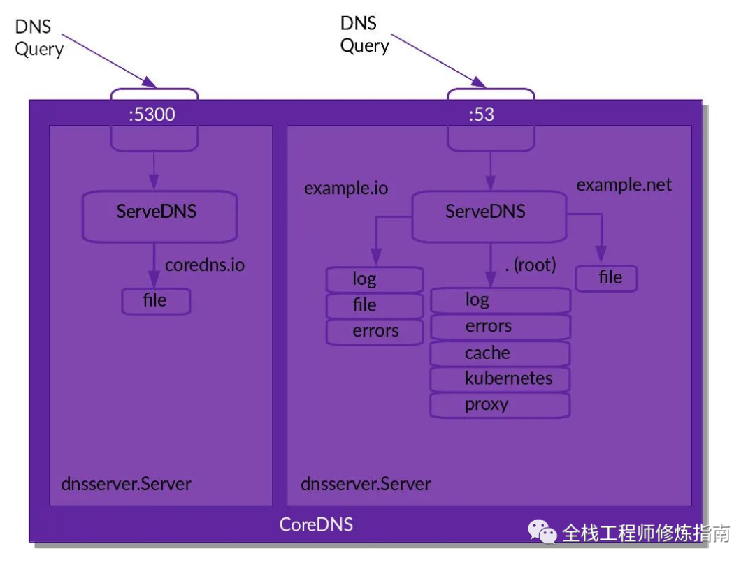 其实从功能角度来看,CoreDNS 更像是一个通用 DNS 方案(类似于 BIND),然后通过插件模式来极大地扩展自身功能,从而可以适用于不同的场景(比如 Kubernetes)。正如官方博客所说:CoreDNS is powered by plugins.