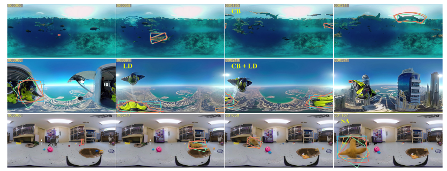 此外,还提供了 4 种无偏差的ground truth,包括(旋转)边界框和(旋转)边界视场,以及为 360° 图像量身定制的新指标,从而可以准确评估全景跟踪性能。