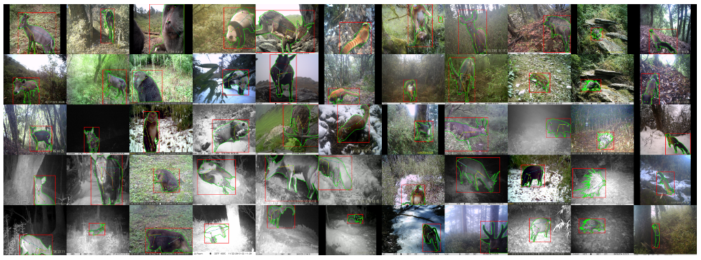 数据集包含了丰富的变化,如生态季节、天气条件、时间段、视角和栖息地场景。到目前为止,已经收集到了至少50万个视频和120万张图像。其中选择并标注了11种濒危动物以进行行为理解,包括1万个视频序列用于动作识别任务,2.8万张图像用于目标检测、实例分割和姿态估计任务。此外,还收集了7千张同一物种的网络图像作为源域数据,用于域自适应任务。