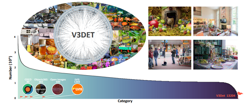 V3Det是一个用于视觉目标检测的大规模词汇视觉检测数据集,具有精确标注的大规模图像边界框。该数据集具有以下吸引人的特点: