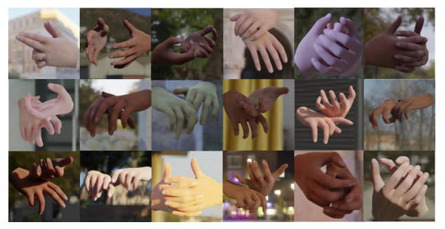 RenderIH是一个大规模的合成数据集,旨在提供准确和多样化的姿势标注,以用于交互手部研究。该数据集包含了100万张照片逼真的图像,具有各种不同的背景、视角和手部纹理。