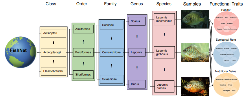 FishNet 是一个大规模多样化的数据集,包含了来自 17357 种水生物的 94532 张精心整理的图像。这些图像根据水生物的生物分类学(目、科、属、种)进行了组织。旨在满足对能够识别、定位和预测物种及其功能特征的系统需求。