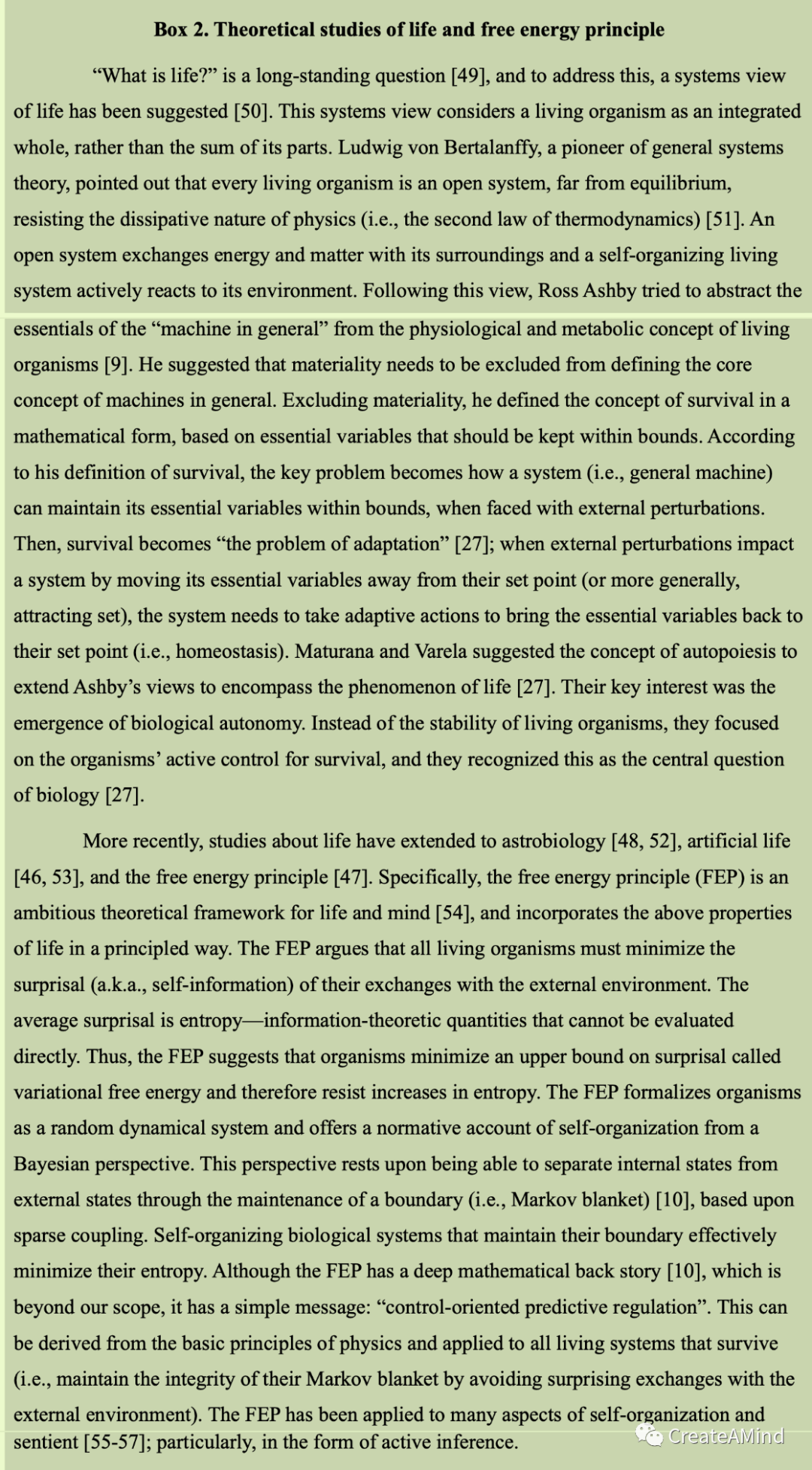 最近,关于生命的研究已经扩展到天体生物学[48,52],人工生命[46,53]和自由能原理[47]。具体来说,自由能原理(FEP)是一个雄心勃勃的生命和心灵的理论框架[54],并以原则性的方式纳入了生命的上述属性。FEP认为,所有生物都必须最大限度地减少与外部环境交换的惊奇(也就是自我信息)。平均的惊喜是熵——无法直接评估的信息论量。因此,FEP认为,生物会将一个叫做变分自由能的上界最小化,从而抵制熵的增加。FEP将生物体形式化为随机动力系统,并从贝叶斯的角度提供了自组织的规范解释。这种观点基于稀疏耦合,通过维持边界(即马尔科夫毯)[10]将内部状态与外部状态分开。保持边界的自组织生物系统有效地最小化了它们的熵。虽然FEP有一个深刻的数学背景故事[10],这超出了我们的范围,但它有一个简单的信息:“面向控制的预测性监管”。这可以从物理学的基本原理中推导出来,并应用于所有存活下来的生命系统(即通过避免与外部环境进行令人惊讶的交换来维持其马尔科夫毯的完整性)。FEP已被应用于自组织的许多方面