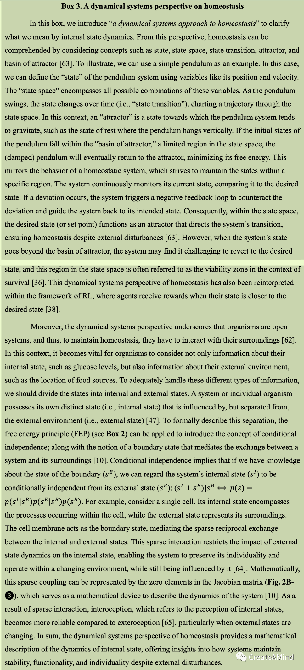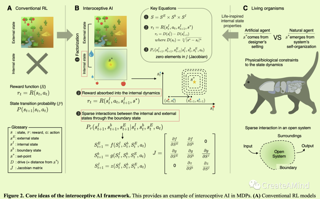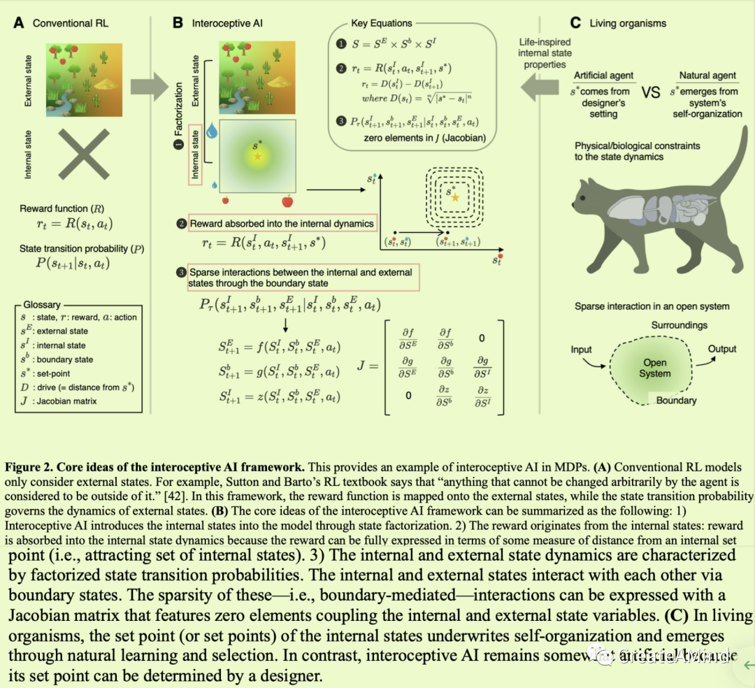 内感受性人工智能框架的主要思想是将智能体视为一个动态开放的系统,其中智能体具有自己的内部状态动力学,与外部环境状态相互作用,同时将生命激发的(即仿生的)属性纳入模型。这可以总结如下(图2): 1)将环境状态分解成内部和外部状态,2)将奖励函数映射到内部环境状态的动态上,以及3)确保内部和外部环境状态仅通过边界状态相互作用。与传统的人工智能框架相比,内部状态的概念使得内部感知人工智能框架具有独特性。它还继承了控制论[9]和最近关于生命和自由能原理[46-48]的理论工作中的基本变量概念(方框2)。注意,此后我们将互换使用术语“基本变量”和“内部状态”,因为前者仅仅是表示内部状态变量的宏观成分的抽象形式。