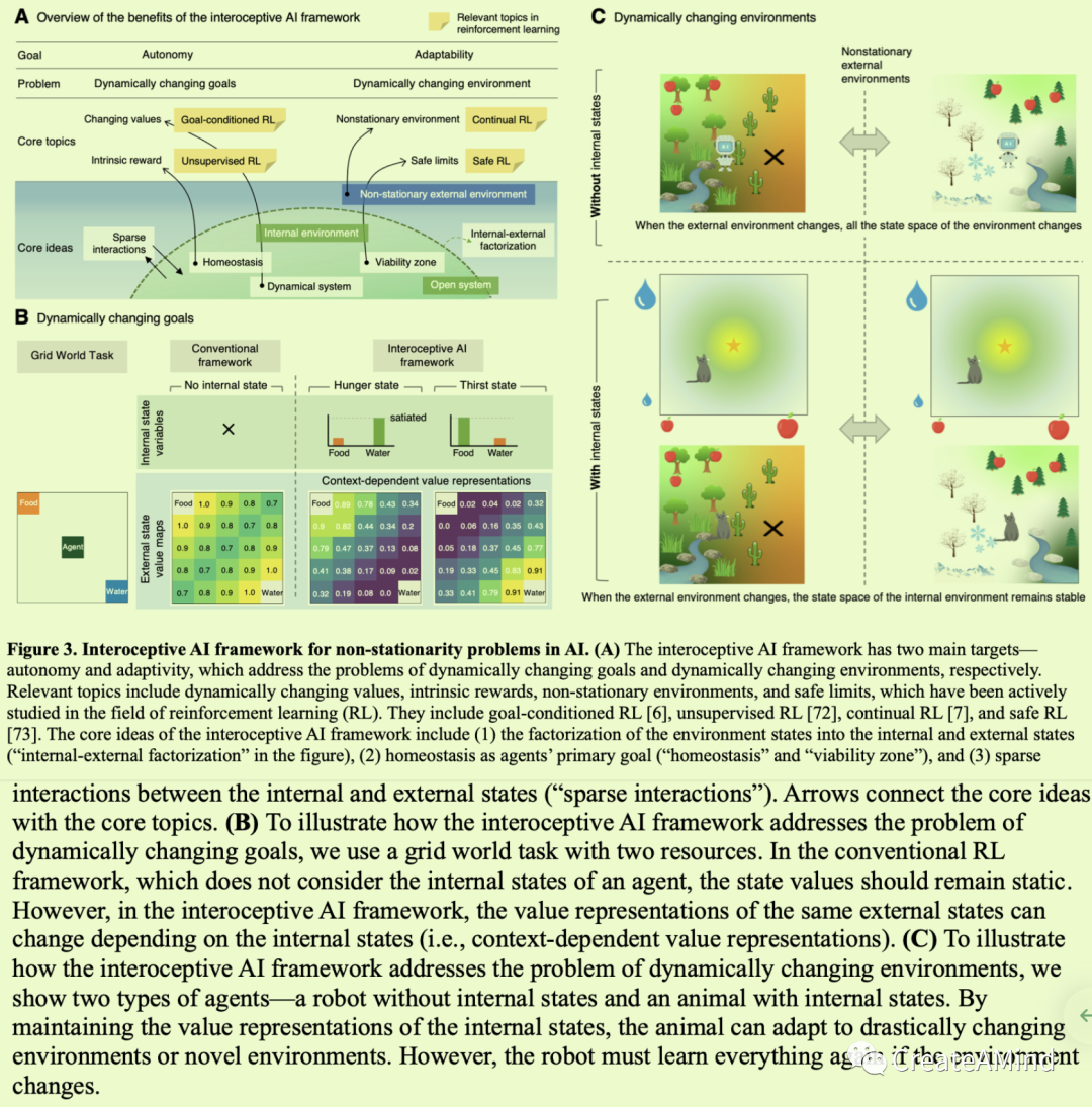 内感受性人工智能框架非常适合于创建能够根据其内部状态以灵活的方式调整其目标的主体[67]。通过将代理的目标映射到内部状态动态,内感受性人工代理可以在不同的上下文中灵活地调整他们的目标[68]。例如,在图3B所示的双资源网格世界场景中,饥饿但不口渴的动物更重视食物而不是水,而口渴但不饥饿的动物更重视水而不是食物——即,活生物体可以通过使用它们的内部状态作为上下文信号来改变它们的目标和价值[68]。在RL领域,这种依赖于上下文的评估已经在一般价值函数的标题下进行了研究,这通常依赖于状态和目标的联合价值函数,以具有基于目标的灵活状态值[69]。此外,分层RL方法[70]或目标条件RL [6]也被建议用于解决类似问题。然而,内感受性人工智能超越了这些RL方法。与传统的RL不同,在传统的RL中,典型地,设计者基于外部状态任意地建立奖励函数,而不考虑他们的状态动态,内感受性AI框架将奖励函数映射到内部状态动态(例如,吸引子或吸引集;见方框3) [71]。这允许奖励函数具有其内在的动力学,具有复杂的和突现的性质。此外,内部状态动态可以作为连续的和动态变化的上下文信号,这使得奖励和外部状态之间的非静态映射成为可能。例如,将食物或水的消费作为潜在奖励的连续决策可能取决于代理的内部状态动态。这引入了相对于外部状态的非平稳性。内部和外部之间的动态相互作用外部状态有助于更灵活地处理报酬的非平稳性。